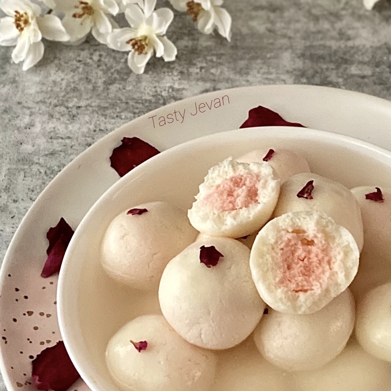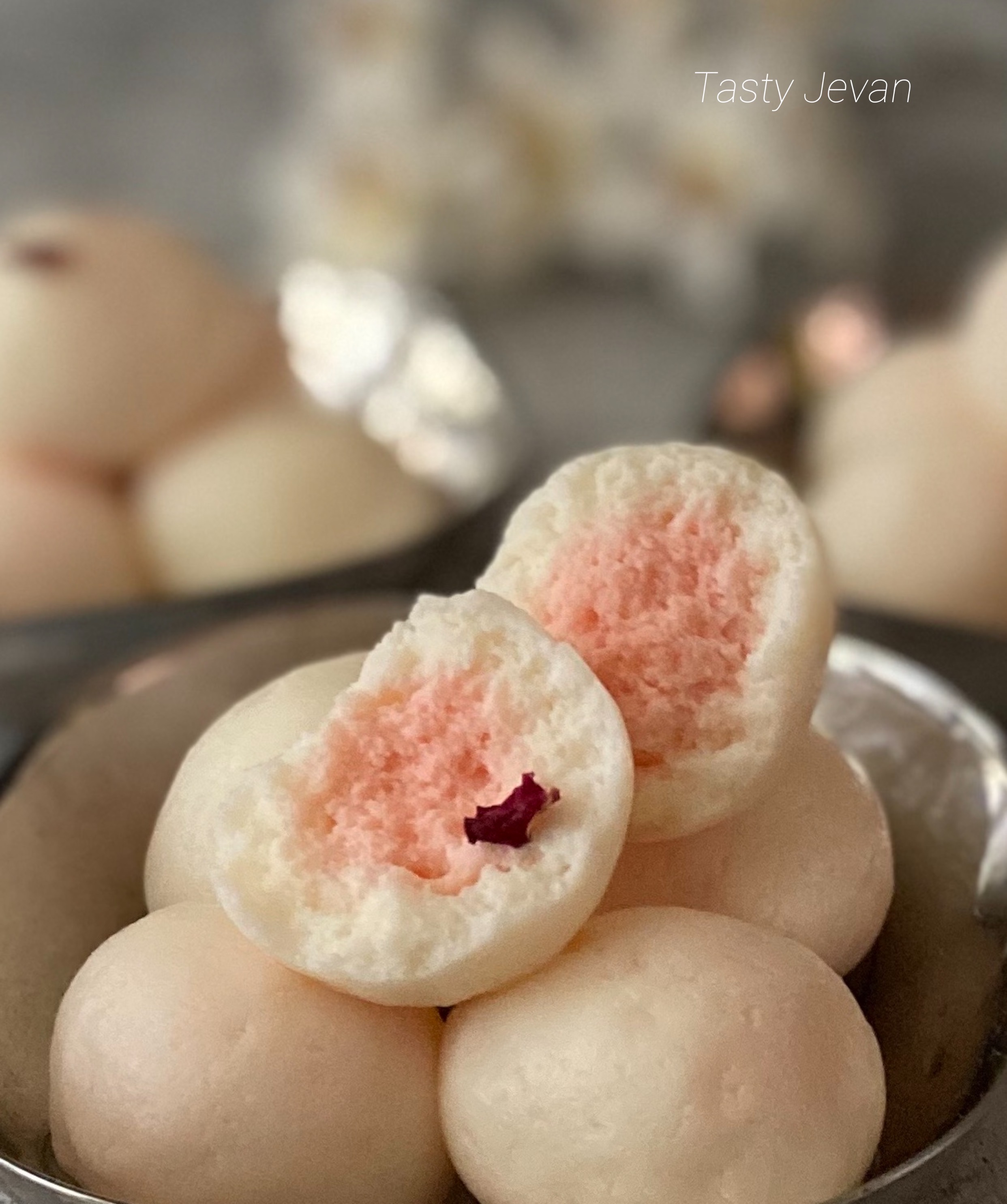 - Take 1 pink piece, make smooth round by rubbing in your palms, wrap it with white layer of paneer and cover pink round completely, make smooth round.
