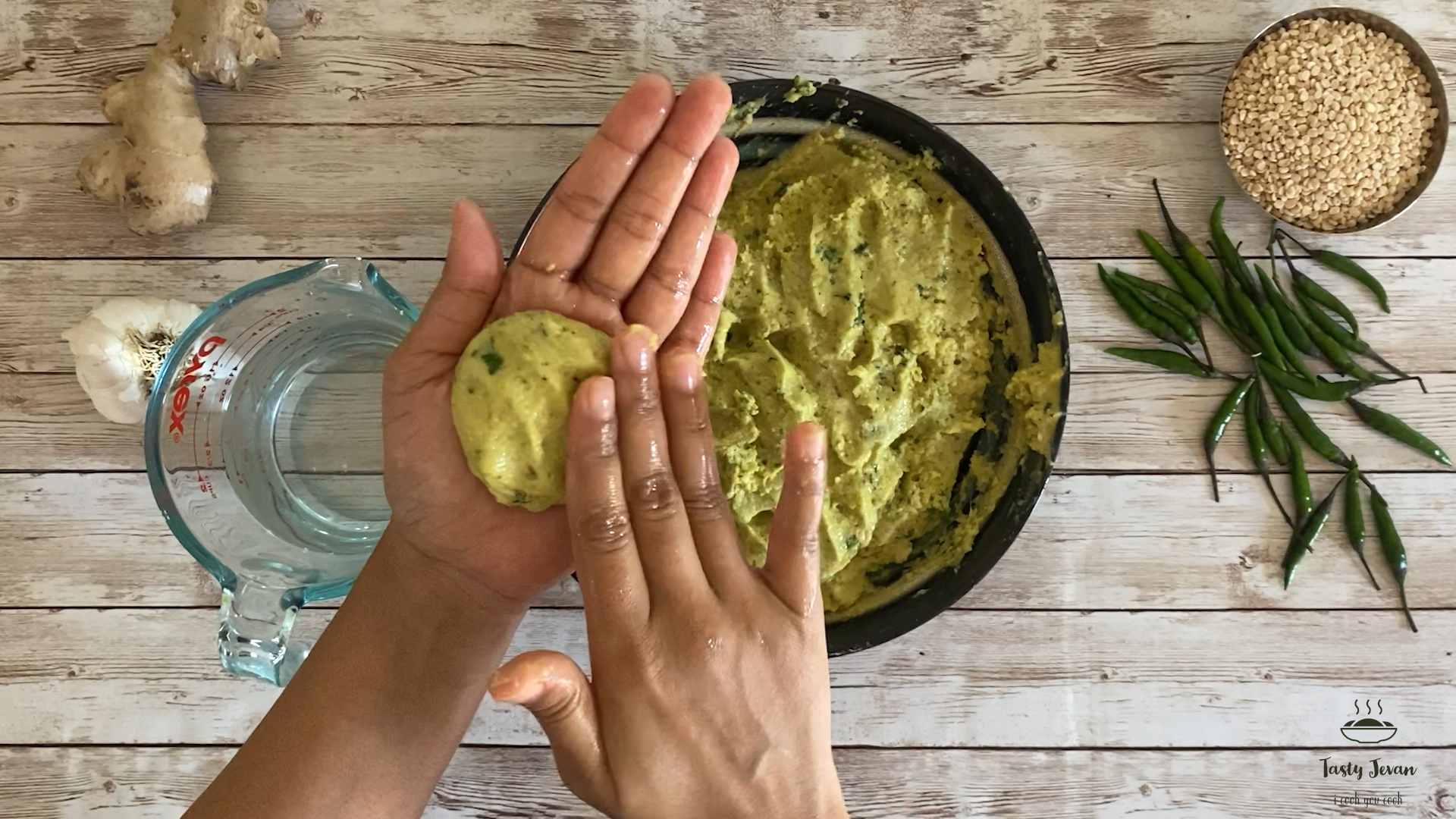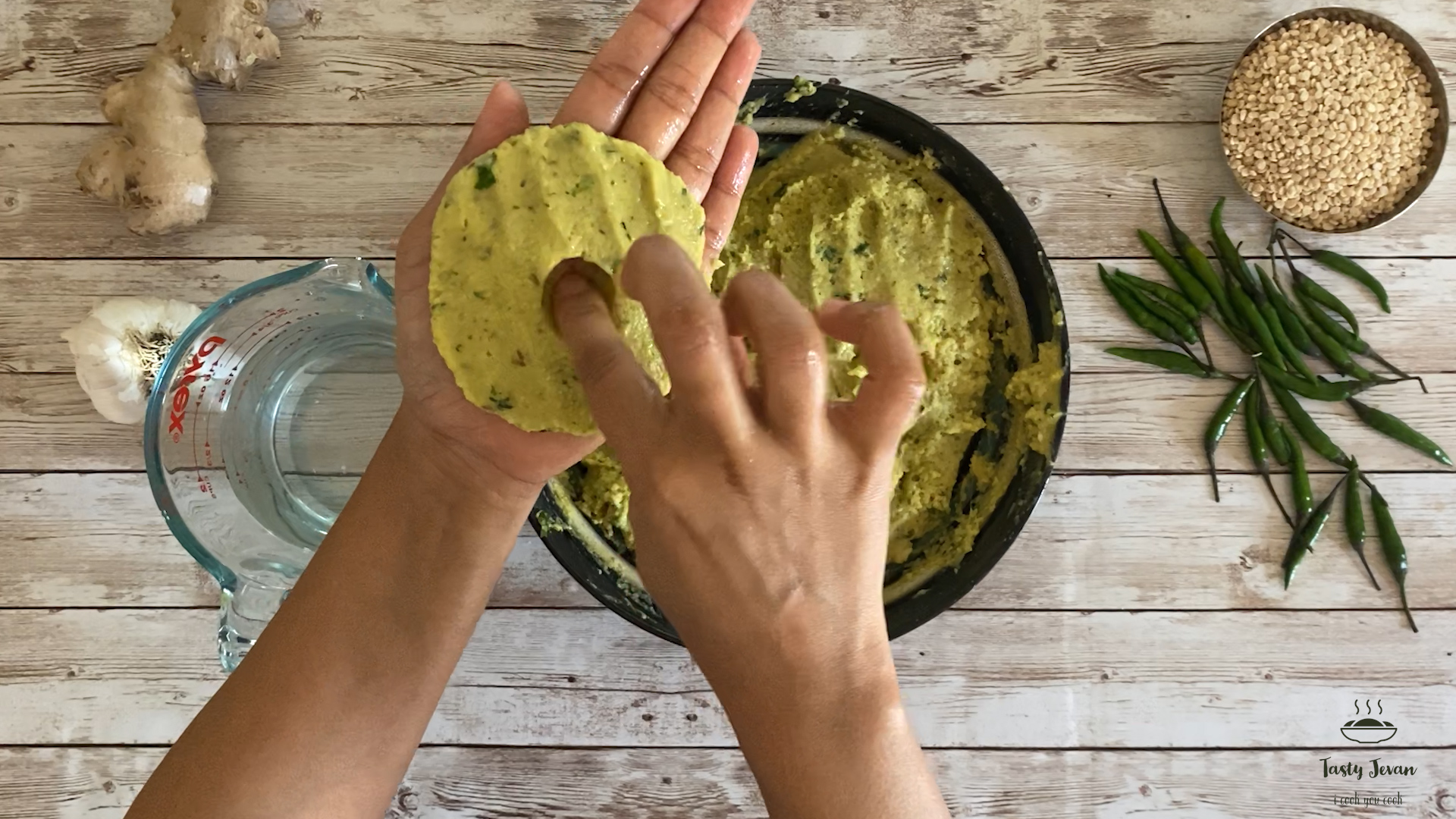 - Wet your palms with water, take lemon size paste make round of paste in palms, now press that round flat make hole in vada
