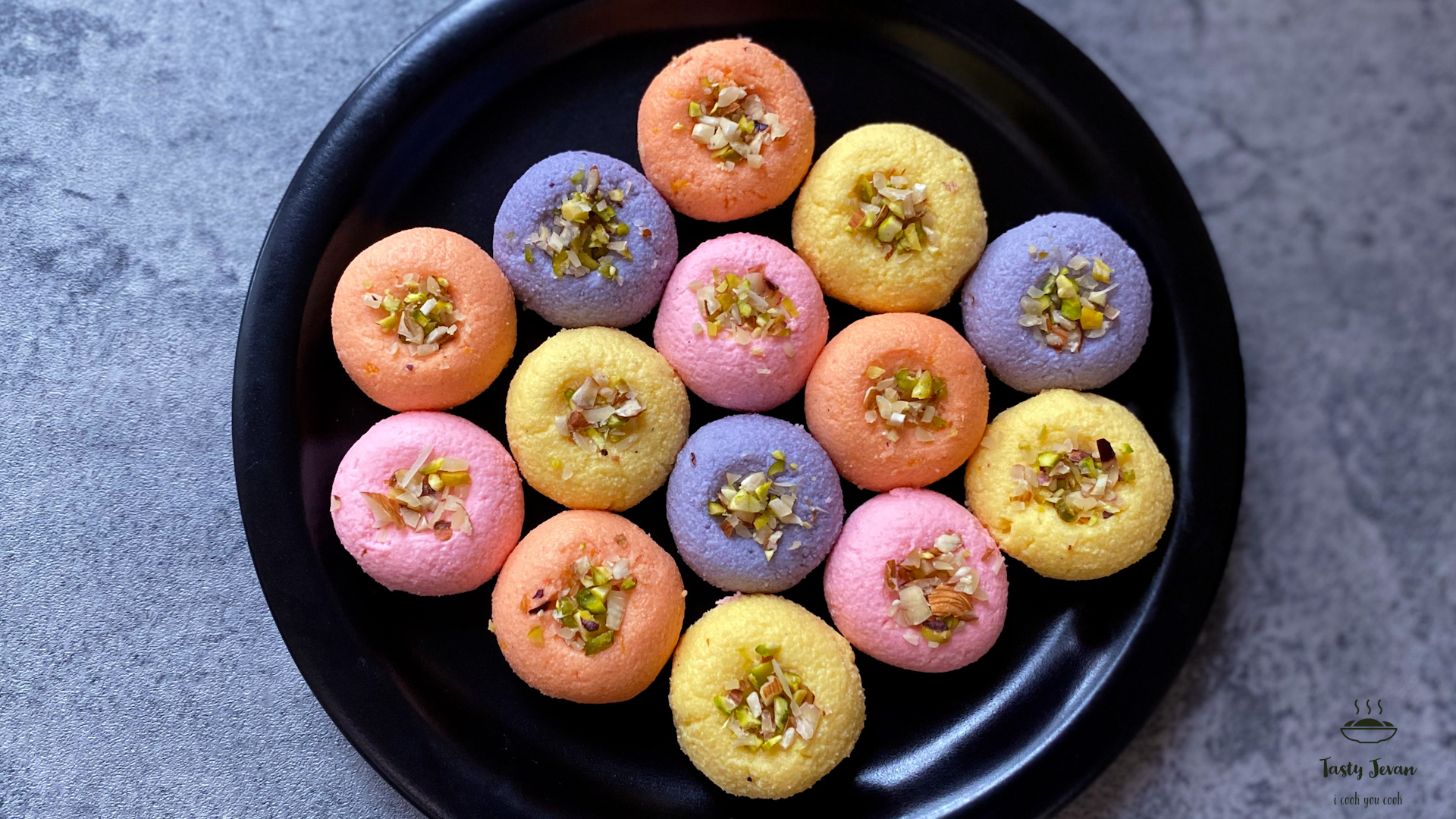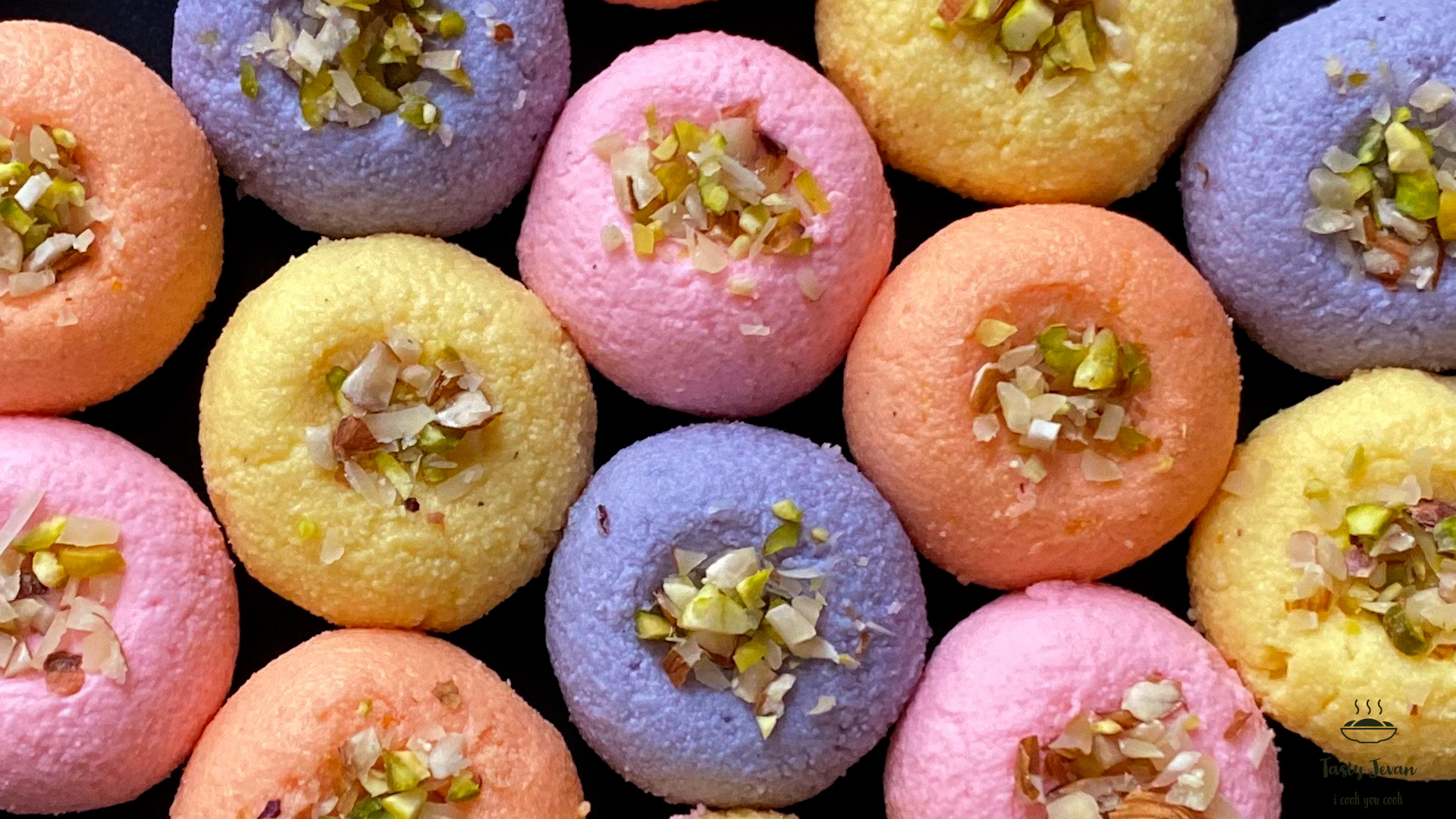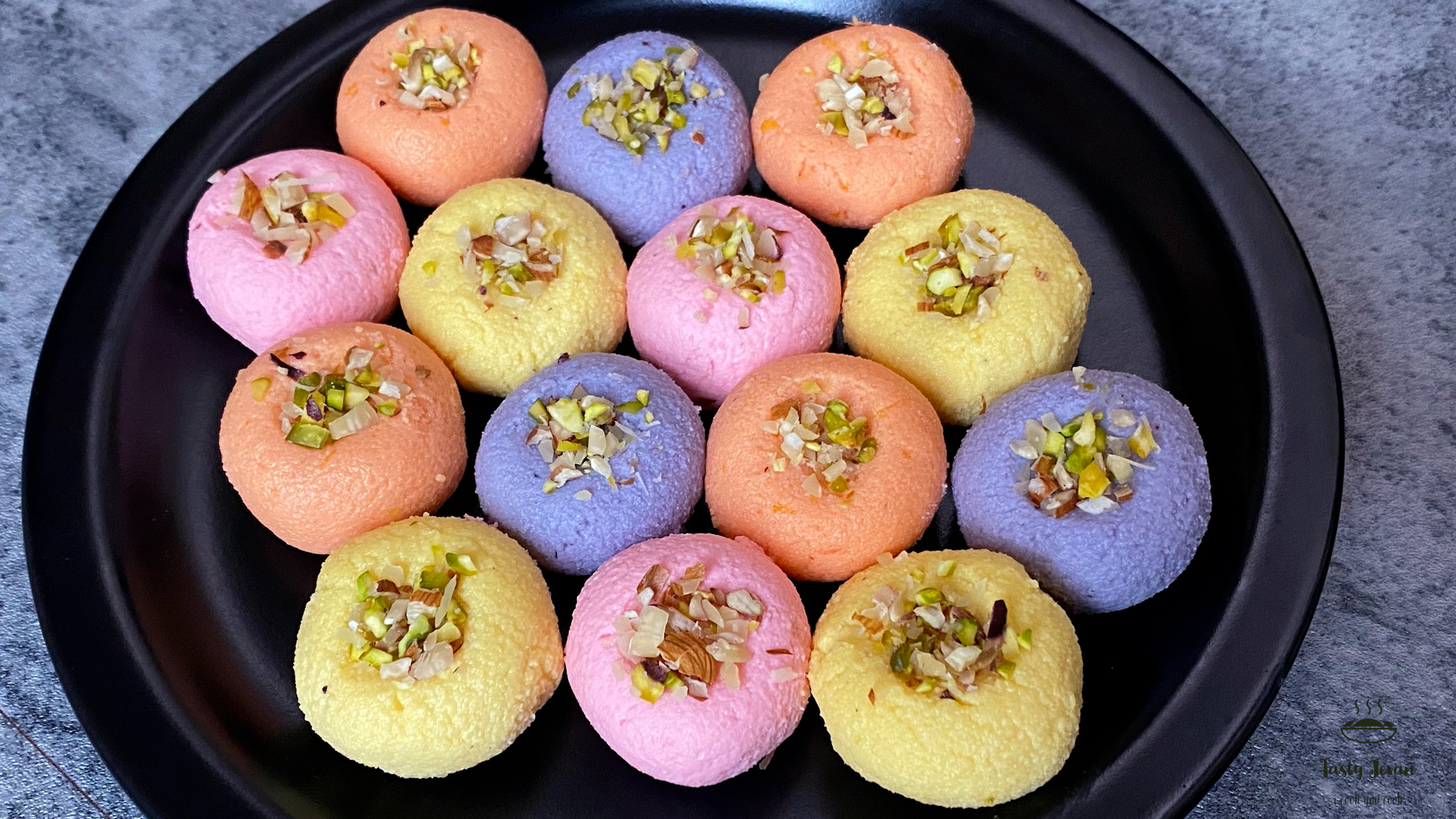- Take one part of paneer, add 1 tbsp powdered sugar, 1/2 tbsp Rose syrup and pinch of cardamom powder