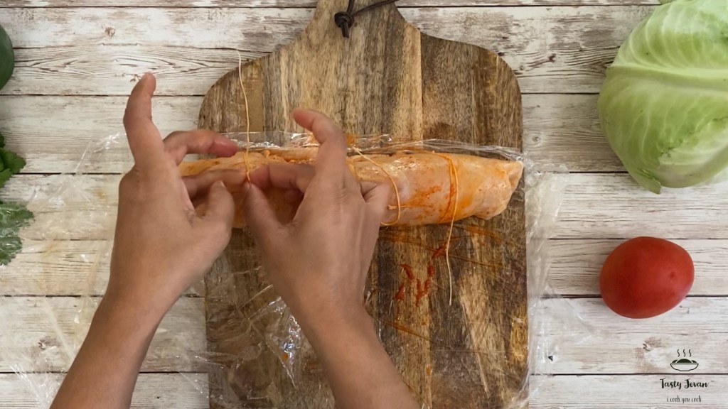 - Once cool down remove all tread and slice chicken roll in small pieces