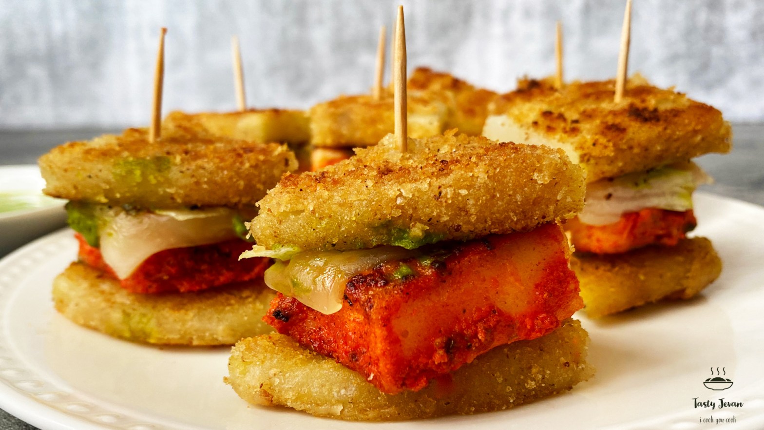 - Now insert toothpicks through all the layers at several places and cut the the sandwich in bite size pieces