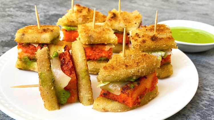 - Now dip potato slices in corn starch slurry, then coat with bread crumbs throughly, repeat again to nice coat over potato slices