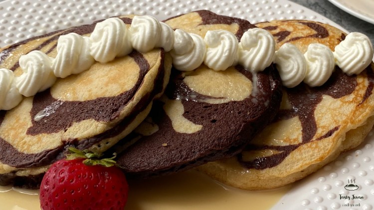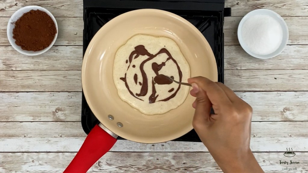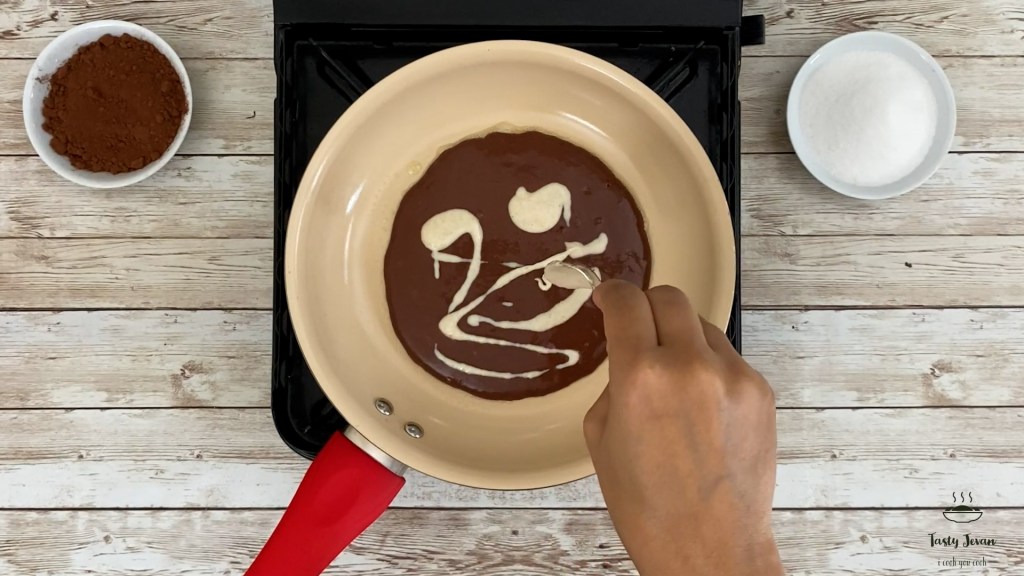 Chocolate Pancake: Pour about 1/4 cup chocolate batter, create desire design with white batter on top