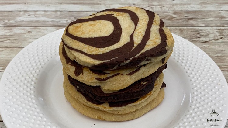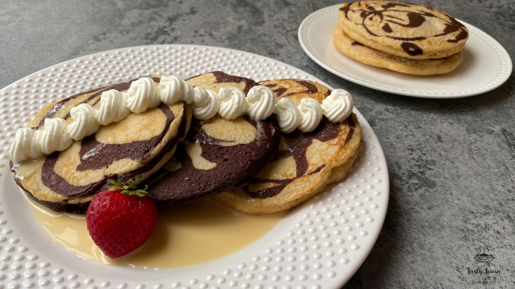- WhitePancake: Pour about 1/4 cup white batter, create desire design with chocolate batter on top