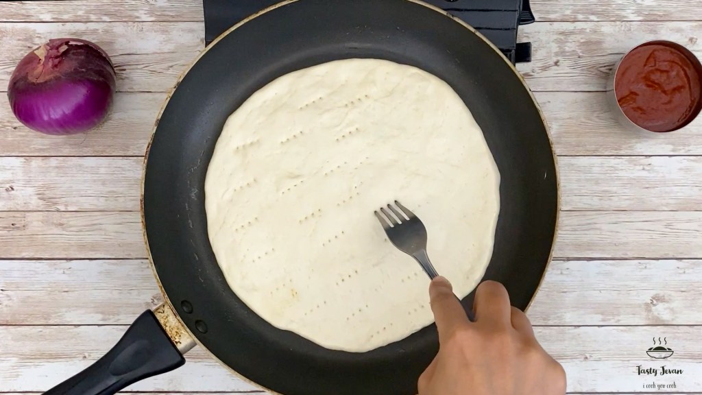 - Place pan on low heat, bake one side for 1-2 min, flip the pizza base.