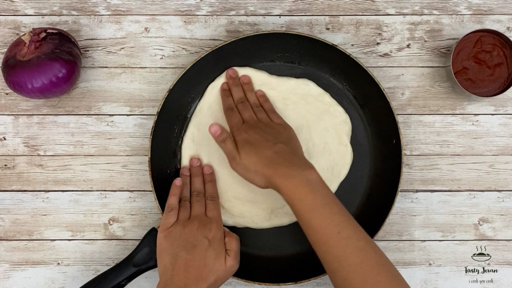 - Take half of dough, flatten and spread it evenly in pan using your fingers. poke holes at several places using a fork
