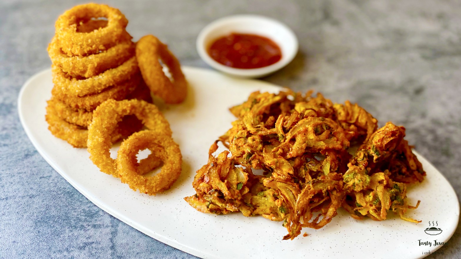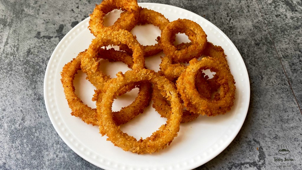 - Crispy onion rings are ready! Serve with Chili sauce, Ketchup