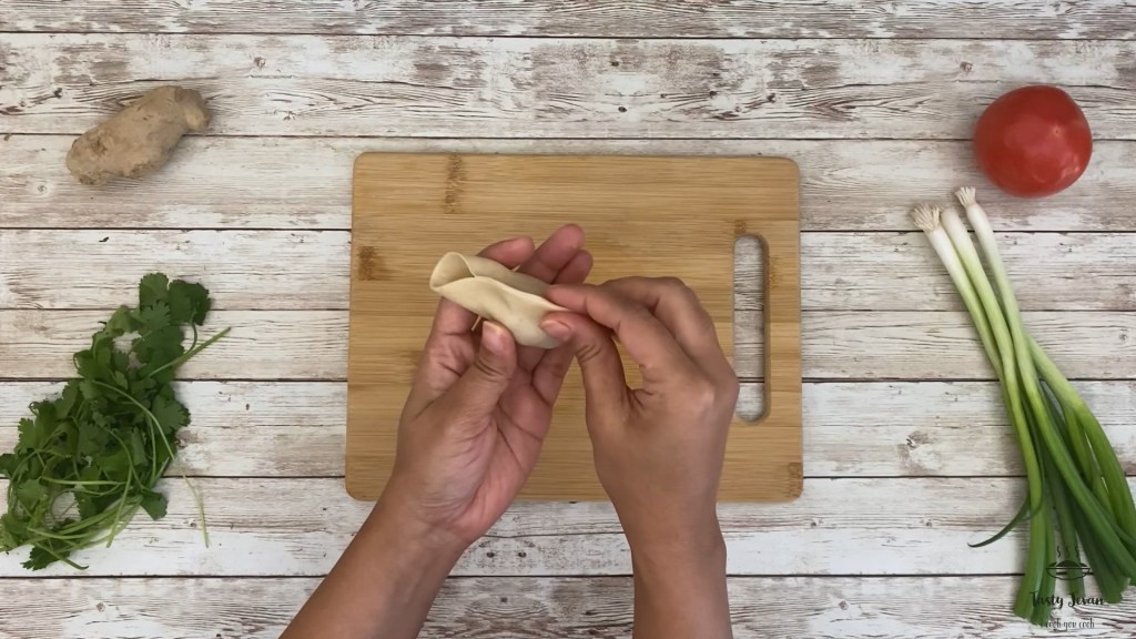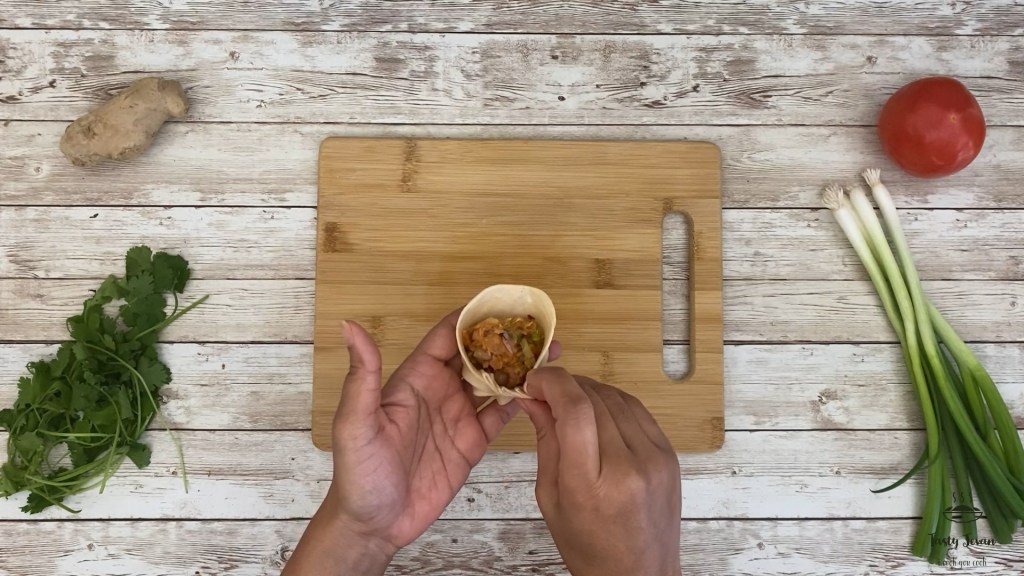 - Take one sheet add a spoonful of filling center, apply drop of water on edges