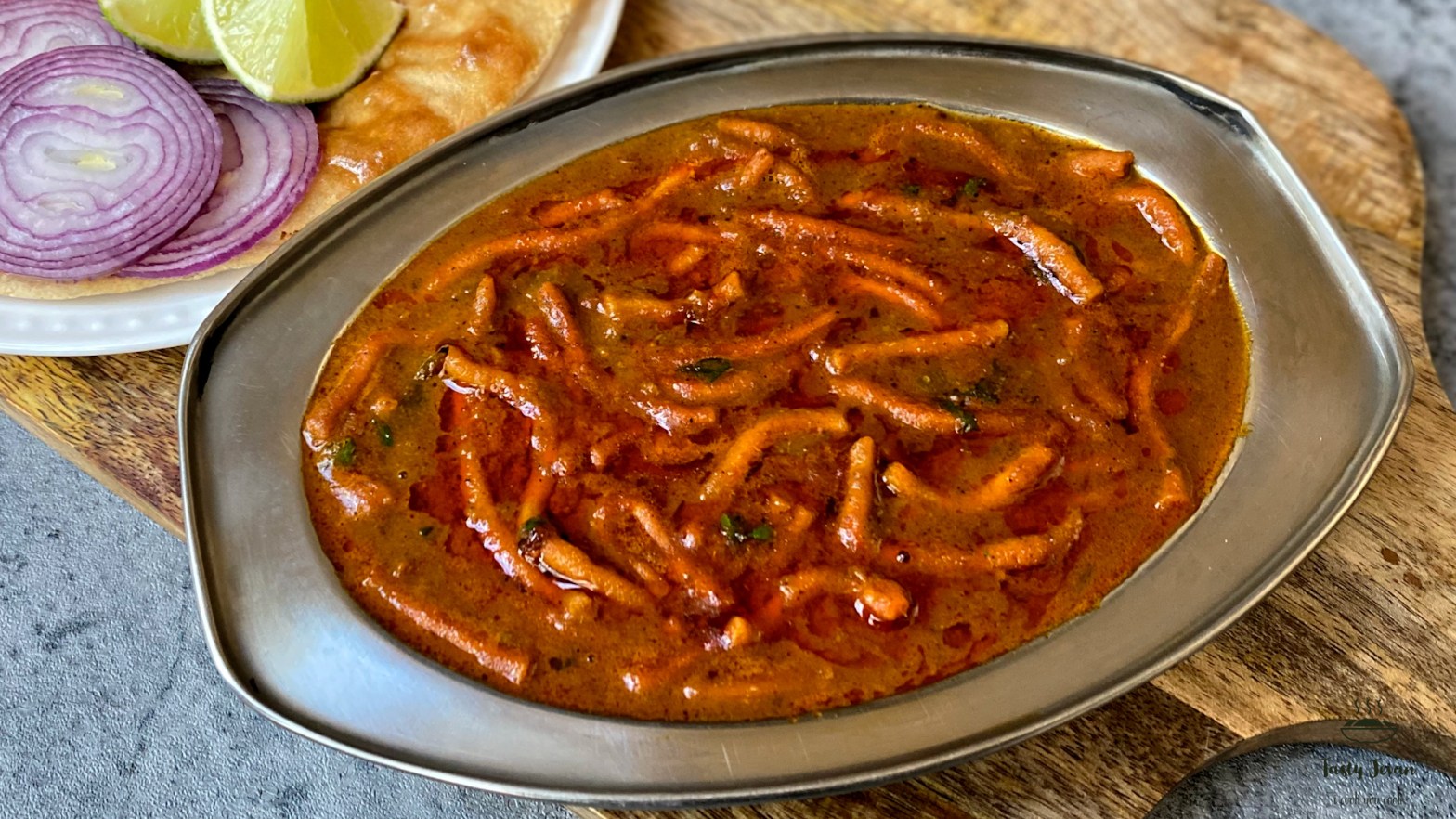 - Add spicy thick sev to the gravy, simmer for additional 1-2 min