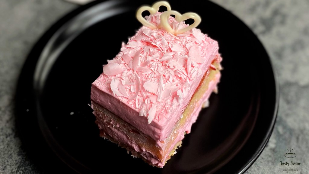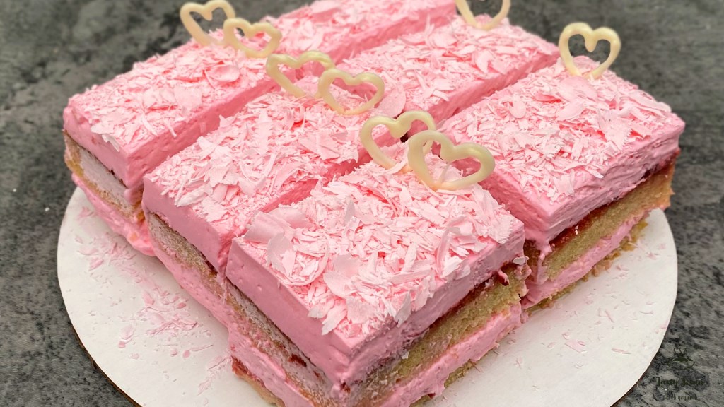 - refrigerate cake for 30 min, now cut cake in pastry pieces 2 by 3 or 3 by 3