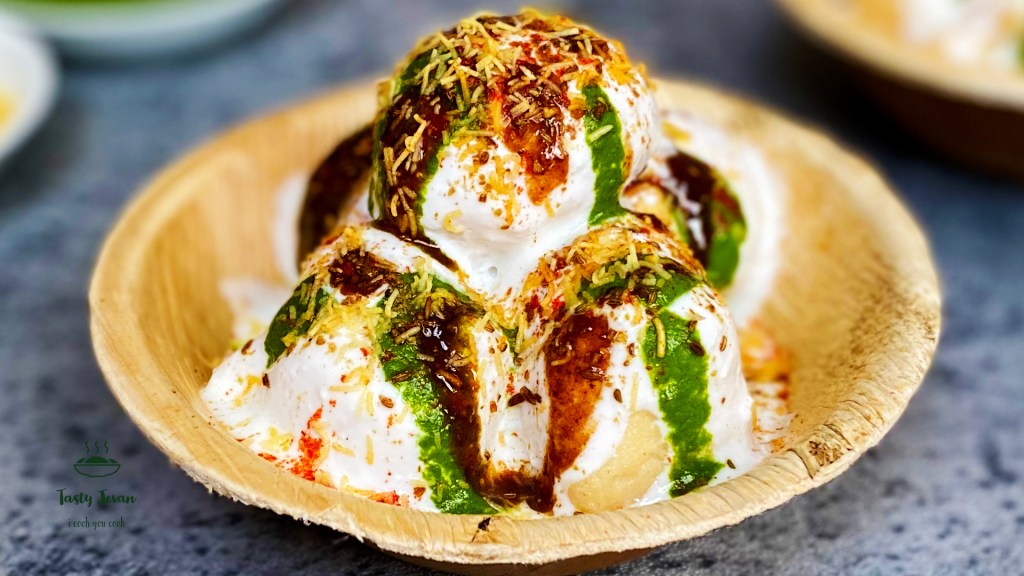 - Top with 1-2 tsp green chutney, 1-2 tsp sweet tamrind chutney, pinch of roasted cumin powder, pinch of ajwain powder, a pinch chaat masala, pinch of red chili powder, top with Nylon sev