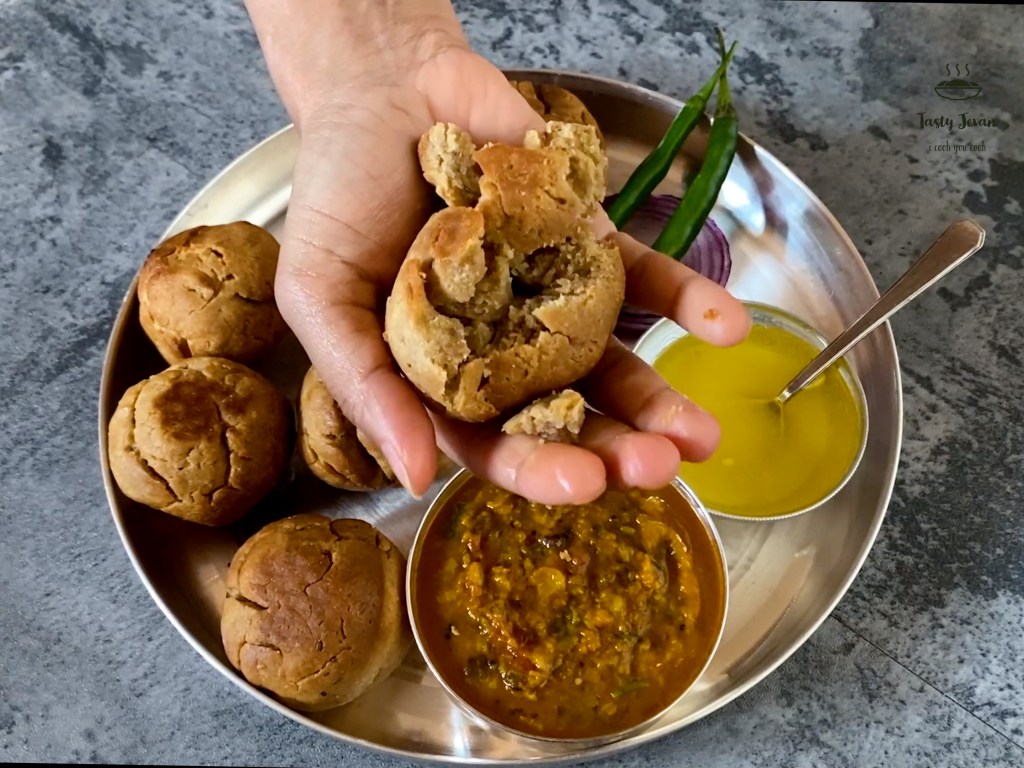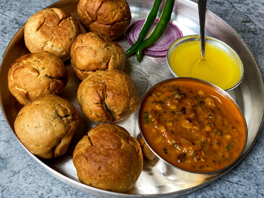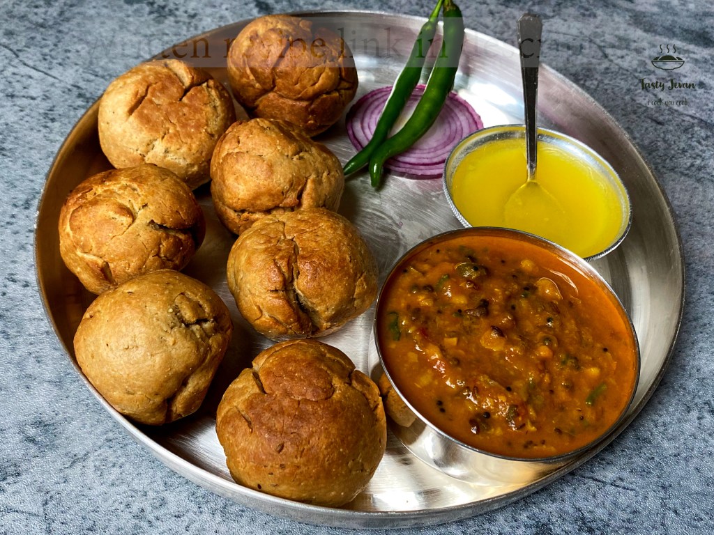 - Heat a pan, add a 1 tbsp ghee, add bati balls to pan, cover and bake