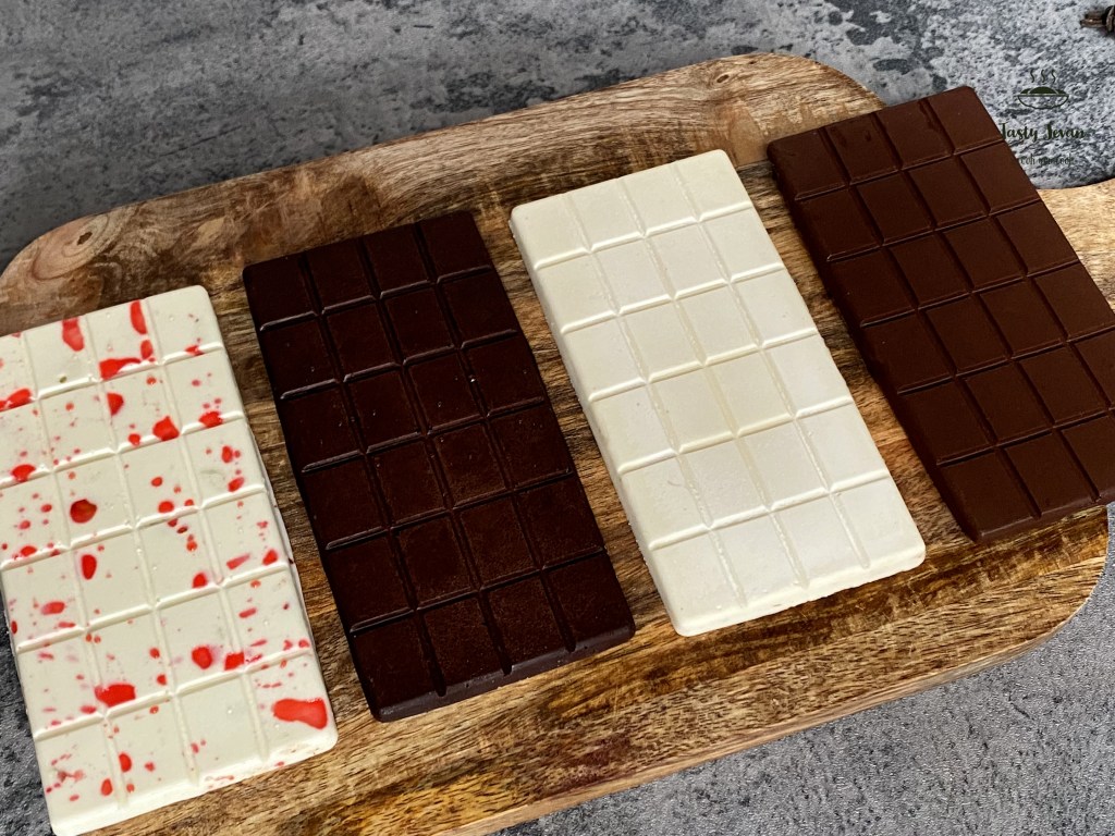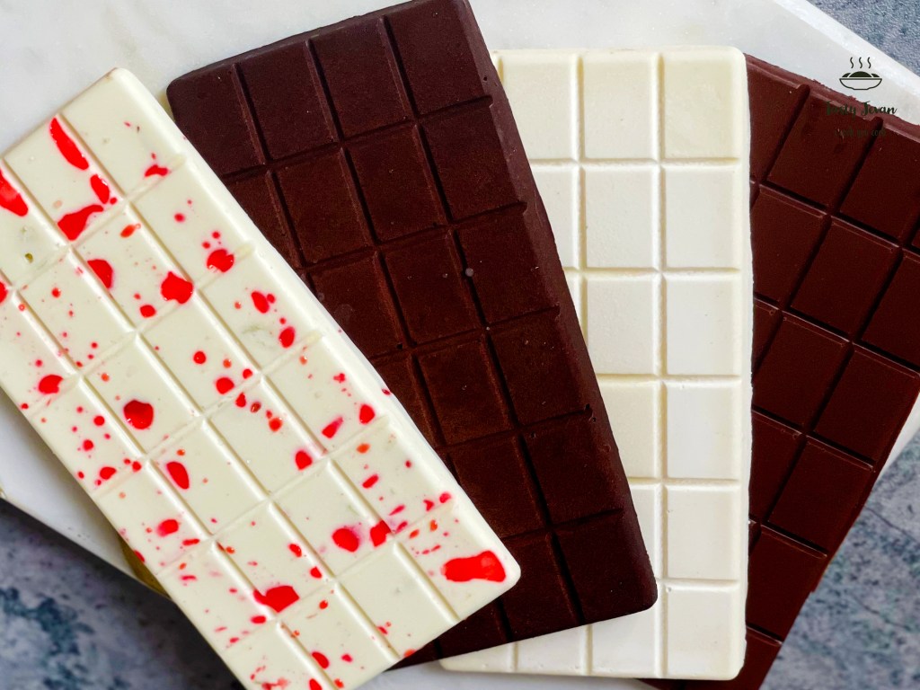 - Take chocolate bar mold, sprinkle some pistachio flakes and drop some rose syrup on base of mold