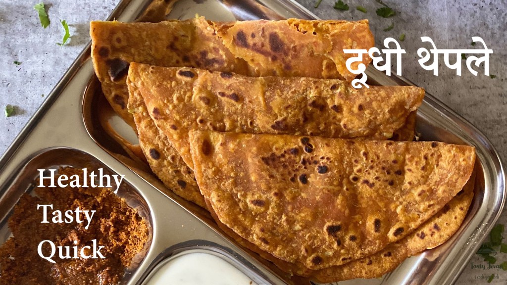 Thepale/ Parathe / Dhapate are quick byte meal, enjoyed by all, Often paired with variety of Chutnies, Curd, onion on sides. Thepale is also a very good travel food. Dudhi thepale are made with grated Dudhi / Bottle gourd mixed with flour and enhanced with spices. This is my version of this recipe