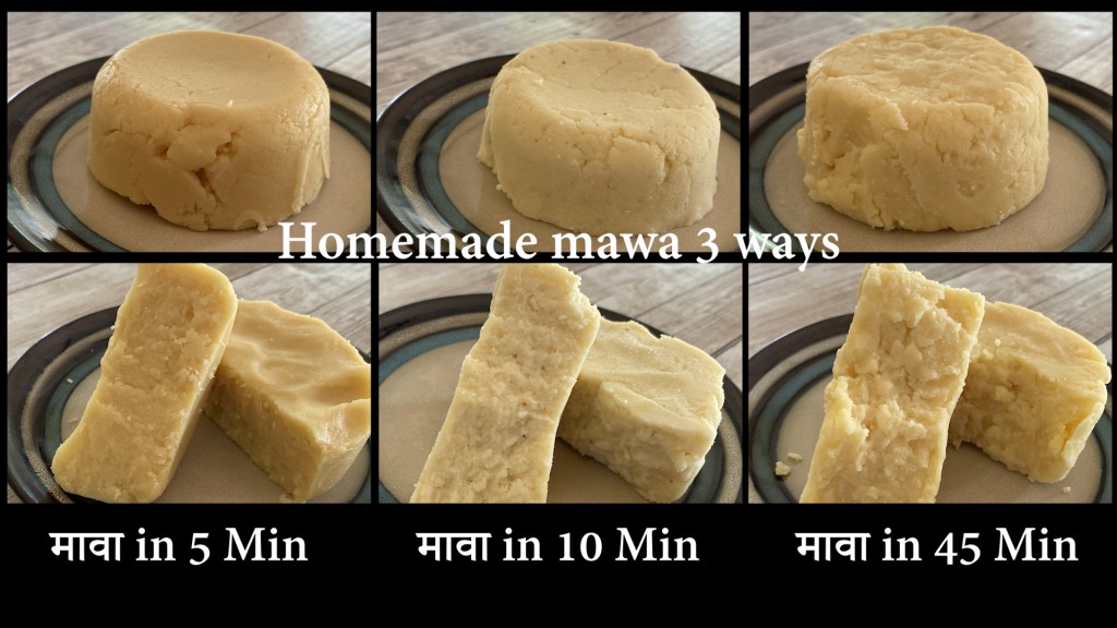 Many Indian sweets are made from Khawa, This is recipe of homemade Mawa in three ways. 1. Quick with Milk powder 2. Easy made with Ricota cheese 3. Traditional made with Milk Sweets made from homemade mawa are tastier, pure and hygienic.