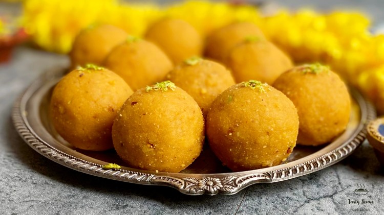 Besan ladoos are just integral part of Diwali and many other festivities, this is one such recipe I have enjoyed all my childhood. When families health is on mind you come up with ideas, so I made a tweak instead of frying ladoos I bakes them on tava. Besan poories baked, crumbled and mixed with sugar syrup. Easy to make Besan Ladoo recipe. These turned out awesome and my kids loved it, do try and share your feedback