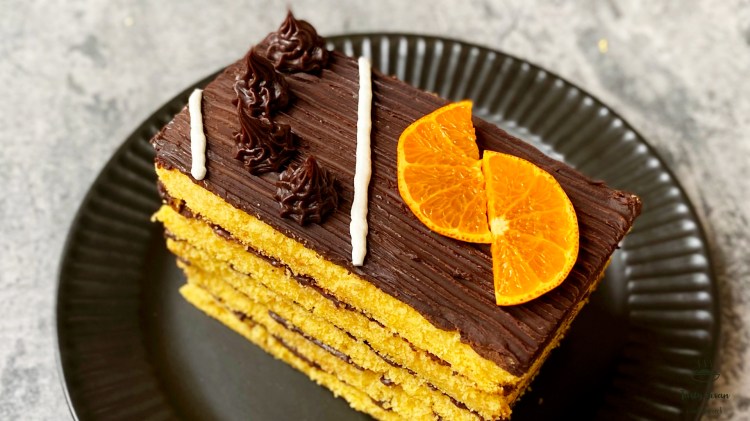 Layered fresh of orange cake with chocolate fudge. Orange flavored cake baked to perfection, sliced and stacked 5 beautiful layers. Each layer is held together with chocolate fudge, topped with thick chocolate fudge layer and whipped/ chocolate topping. Fresh, soft, chocolatey cake. do try and share your feedback